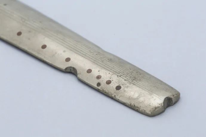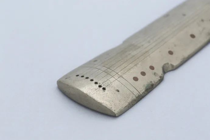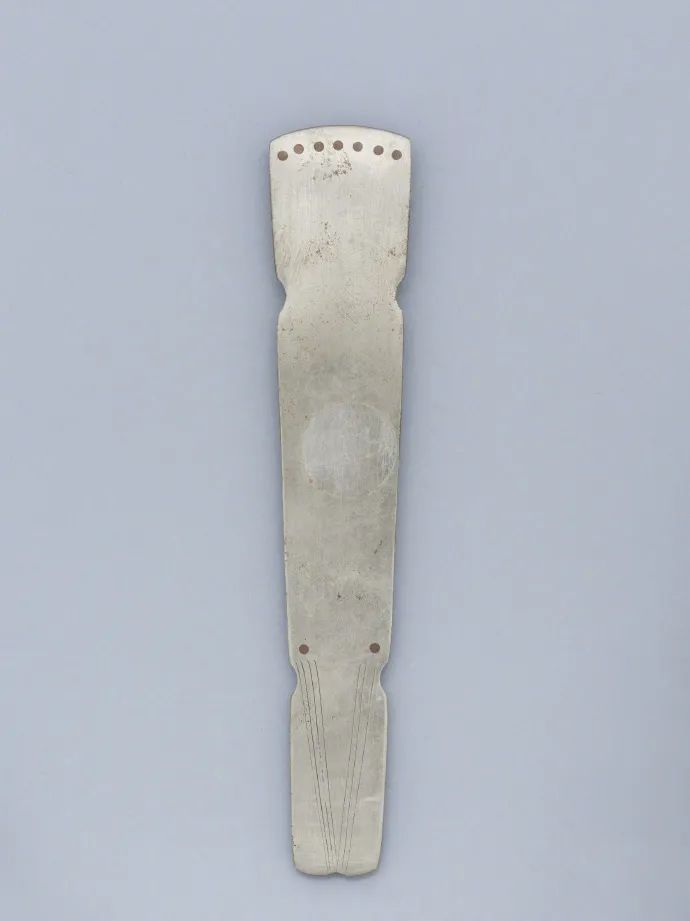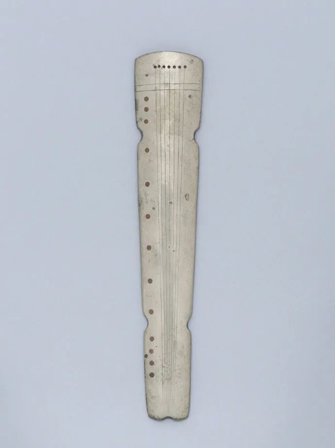 这是一件清代白铜质的镇尺,材质细腻、手感温润。此为仲尼式古琴形——自琴额以下渐收,结构表现完整。一般置于书桌,体现文人高雅的生活情操。
