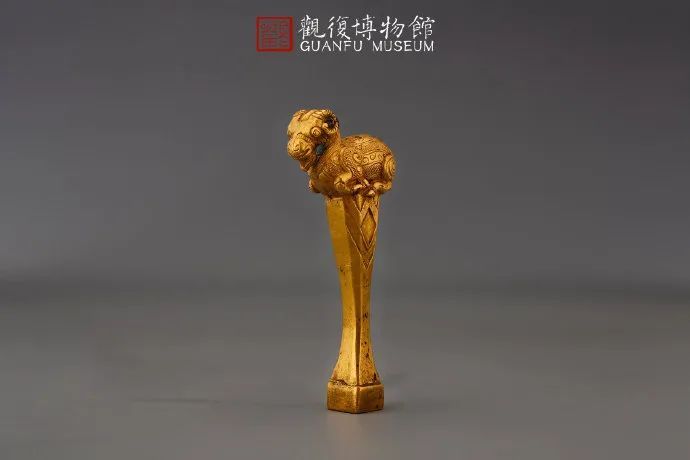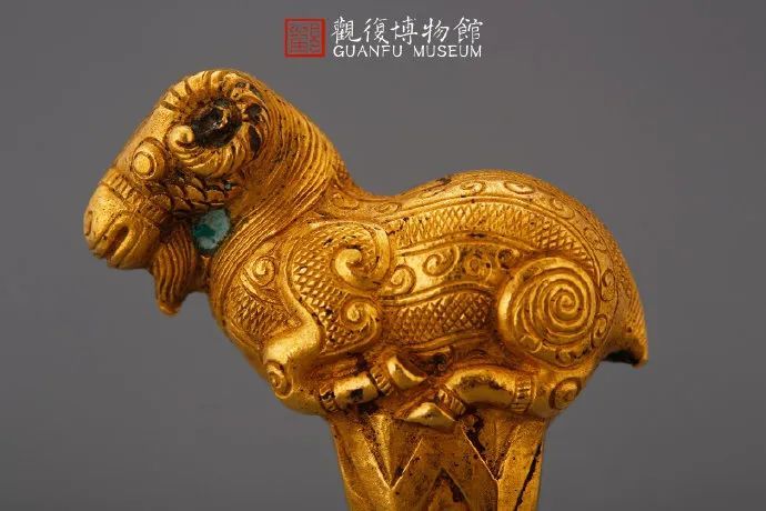 这是一件西汉时期的卧羊首金琴轸匙。上部伏卧一羊,羊身以绞纹、重鳞纹、细网格纹及勾云纹来表现羊角、脸颊、身体及脊背,羊首下有一穿孔,可穿系佩带。集功能性和装饰性为一身,造型高贵,绝非凡品。
