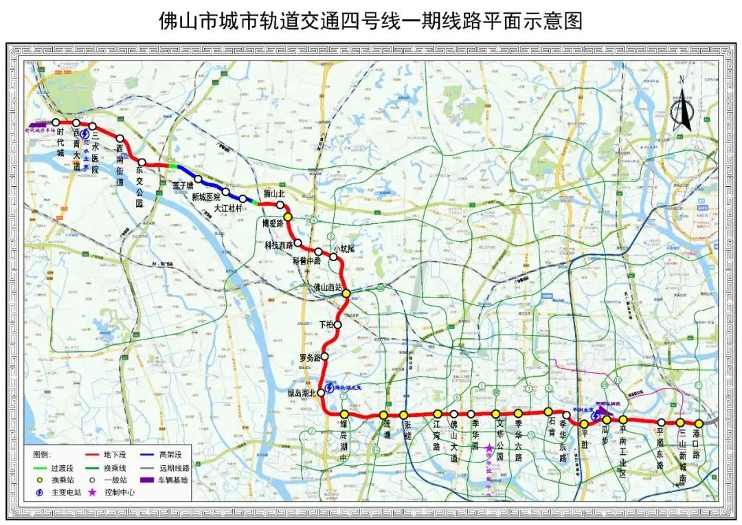 4号线一期为佛山市东西向市域骨干线,串联了三水、南海和禅城,主要辐射三水西南组团、狮山城市副中心、佛山西站高铁枢纽、季华路城市中心区和三龙湾高端创新集聚区等城市重点发展区域。