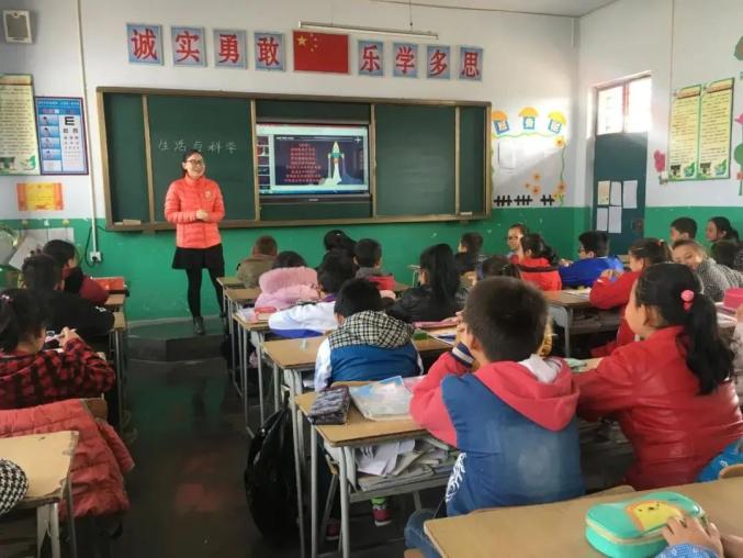 △厦门大学第十七届研支团成员黄一凡在教室中用多媒体上《生活与科学》课程
