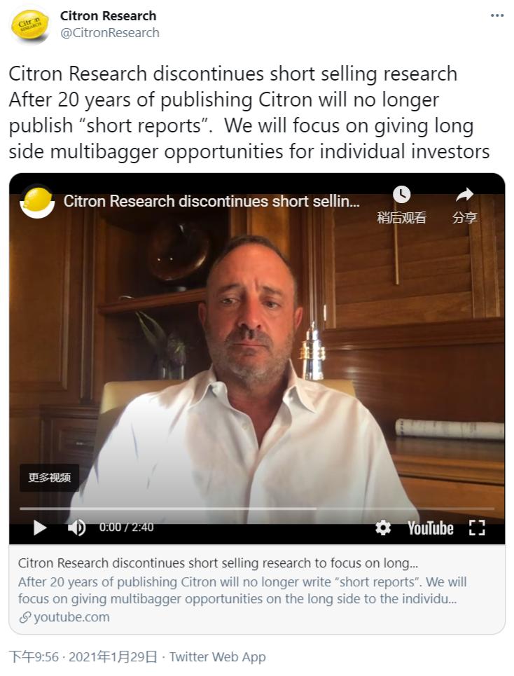 29日晚,美国著名做空机构香橼宣布:“在专注卖空研究20年之后,停止做空研究,将专注于为散户投资者提供长期的多头交易机会。”