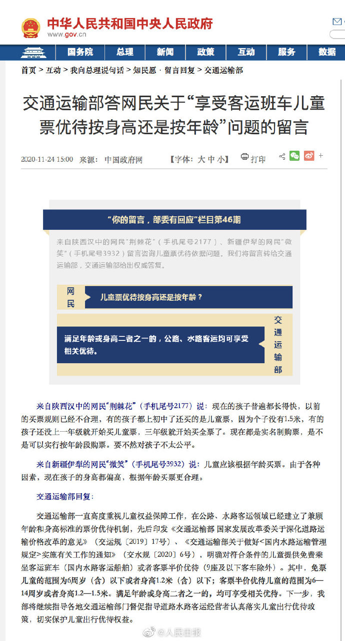 交通运输部一直高度重视儿童权益保障工作,在公路、水路客运领域已经建立了兼顾年龄和身高标准的票价优待机制,先后印发《交通运输部 国家发展改革委关于深化道路运输价格改革的意见》(交运规〔2019〕17号)、《交通运输部关于做好<国内水路运输管理规定>实施有关工作的通知》(交水规〔2020〕6号),明确对符合条件的儿童提供免费乘坐客运班车(国内水路客运船舶)或者客票半价优待(9座及以下客车除外)。其中,免票儿童的范围为6周岁(含)以下或者身高1.2米(含)以下;客票半价优待儿童的范围为6—14周岁或者身高1.2—1.5米。满足年龄或身高二者之一的,均可享受相关优待。下一步,我部将继续指导各地交通运输部门督促指导道路水路客运经营者认真落实儿童出行优待政策,切实保护儿童出行优待权益。据中国政府网