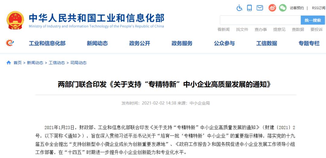 2月2日,财政部、工业和信息化部联合印发《关于支持“专精特新”中小企业高质量发展的通知》。