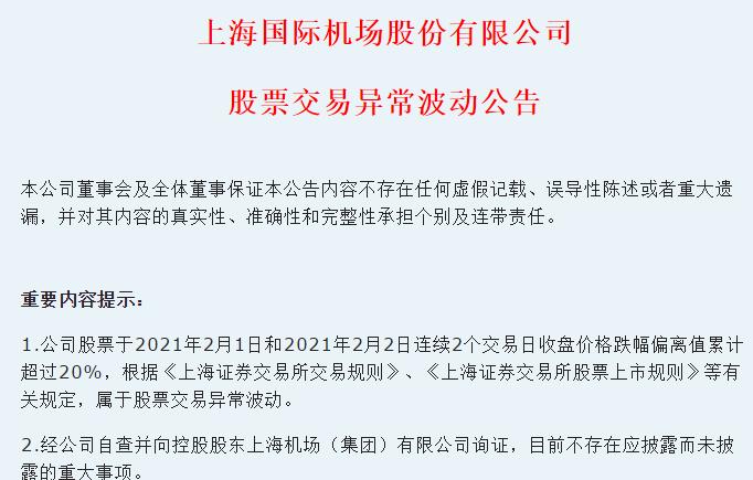 2日盘后,上海机场发布交易异常波动公告称,公司股票连续两日跌停,经查,公司不存在应披露而未披露的重大信息,未发现对公司股票交易价格可能产生重大影响的媒体报道或市场传闻。