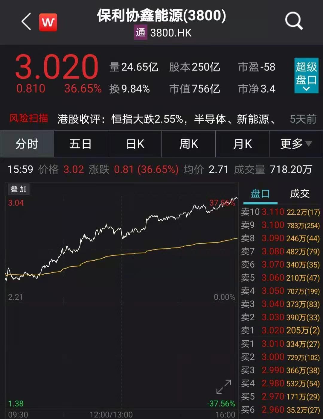 2月2日,光伏龙头保利协鑫能源暴涨近40%。截至发稿,该股上涨36.65%,总市值超过750亿港元,年内已经暴涨134%。