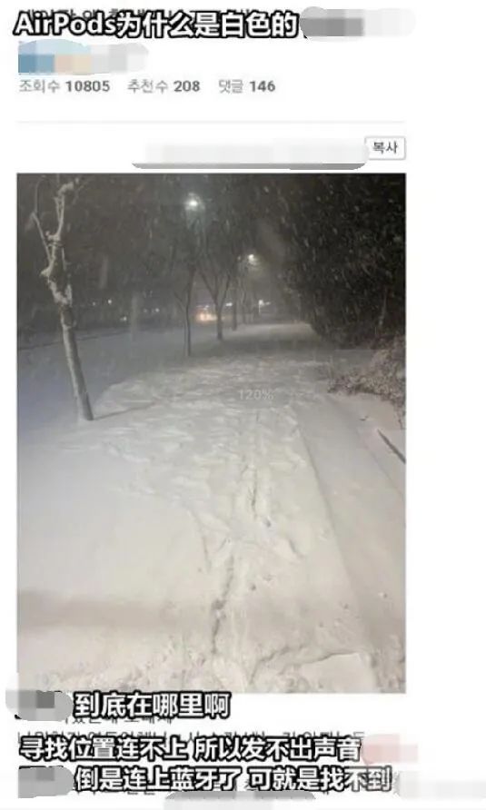 这个话题的起因是一位韩国网友在论坛里发的帖子,有个韩国小哥,耳朵上戴着AirPods去打雪仗,结果AirPods掉雪堆里面和白花花的雪混在了一起了,怎么找都找不到了。