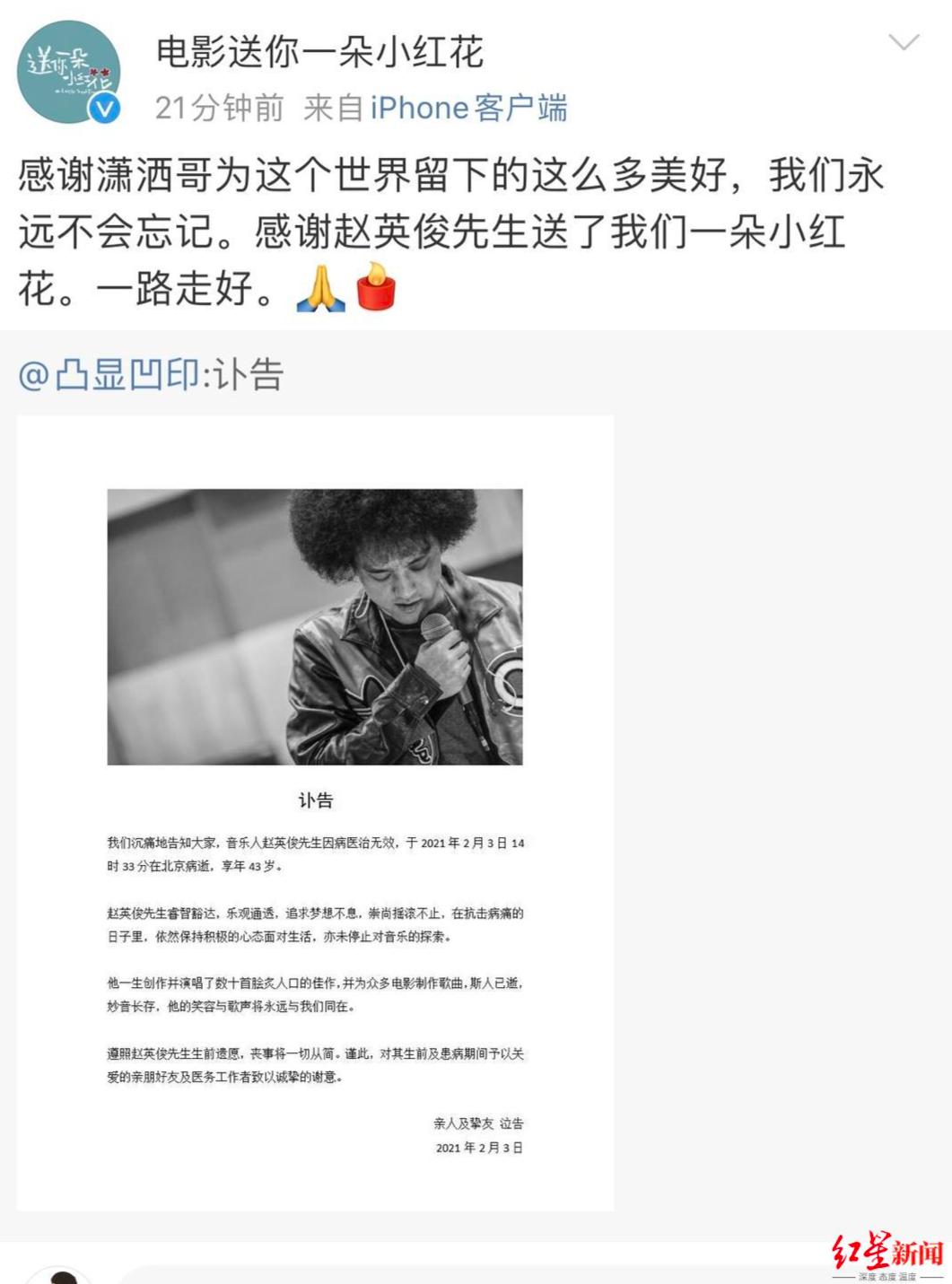 2月3日,音乐人赵英俊因病医治无效,于14时33分在北京病逝,享年43岁。当日晚间8点整,赵英俊的微博@赵英俊是潇洒哥 发布了一篇他提前写好的文章。替赵英俊发文的朋友称,“这是他留给这个世界的最后一篇小作文。”