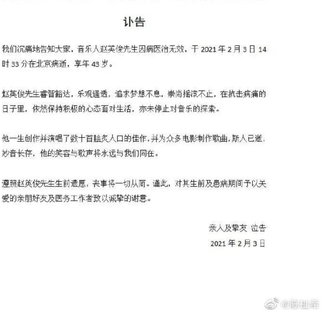 “义无反顾的烈酒啊,多么苦难的日子里,你都已战胜了它,送你一朵小红花,遮住你今天新添的伤疤……”热映中的《送你一朵小红花》主题曲还在影院来回播放,而它的创作和演唱者赵英俊却被曝于2月3日在北京因病去世,终年43岁。消息传来,令圈内好友和网友纷纷表示唏嘘。
