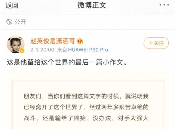 “这也太突然了吧,下午还在听他的歌呢。”赵英俊去世这消息一时间惊呆了众多网友,赵英俊本人的微博在半个月前还依旧更新,与网友互动。