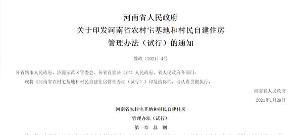 记者从河南政府网获悉,为规范和加强农村宅基地和农村村民新建、改建、扩建、翻建住房(以下统称自建住房)管理,根据《中华人民共和国土地管理法》《中华人民共和国城乡规划法》《中华人民共和国建筑法》等法律、法规和政策规定,河南省人民政府近日印发《河南省农村宅基地和村民自建住房管理办法(试行)》(以下简称《办法》)。《办法》适用于本省行政区域内农村宅基地管理和村民自建住房及其管理,自印发之日起试行。