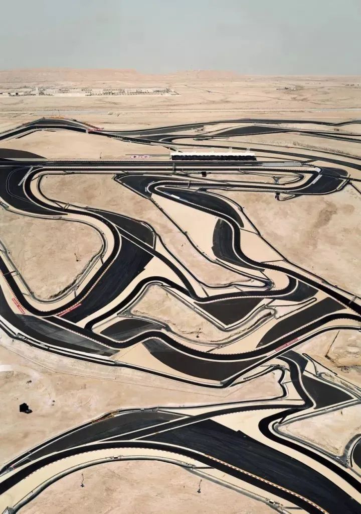 在电视中,古斯基谈到了他最近作品中的一件,是巴林汽车大奖赛赛道的航空视角摄影。这是一幅典型的古斯基影像,场面大,将一种强烈的、近乎抽象的形式感与远处的拍摄对象结合起来。赛道蛇形般地蜿蜒——实际上从空中看起来就像一条巨大的黑蛇——黑色路面上的沥青与沙漠中的白色沙子形成强烈对比,创造出关于金钱、速度与力量的典范之作。
