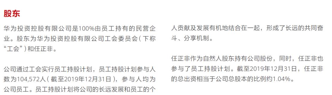 财报显示,华为投资控股有限公司是100%由员工持有的民营企业。股东为华为投资控股有限公司工会委员会(下称“工会”)和任正非。