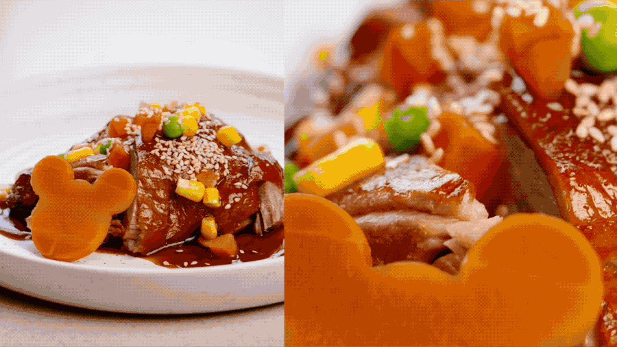 在这里,我们专注中国传统美食,烤鸭、叉烧、红烧肉、糯米鸡。金秋时节,我们还会有时令的蟹粉捞面和蟹粉春卷,在传统的做法上我们还加入了自己的创新,做出上海迪士尼自己特有的风味。