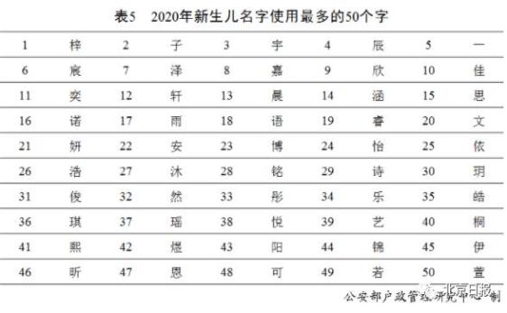 2020年出生并已经进行户籍登记的新生儿名字中,使用频率最高的50个字依次为“梓”“子”“宇”“辰”“一”等。与2019年相比,“玥”“伊”“昕”“可”等字受到新生儿父母的青睐。