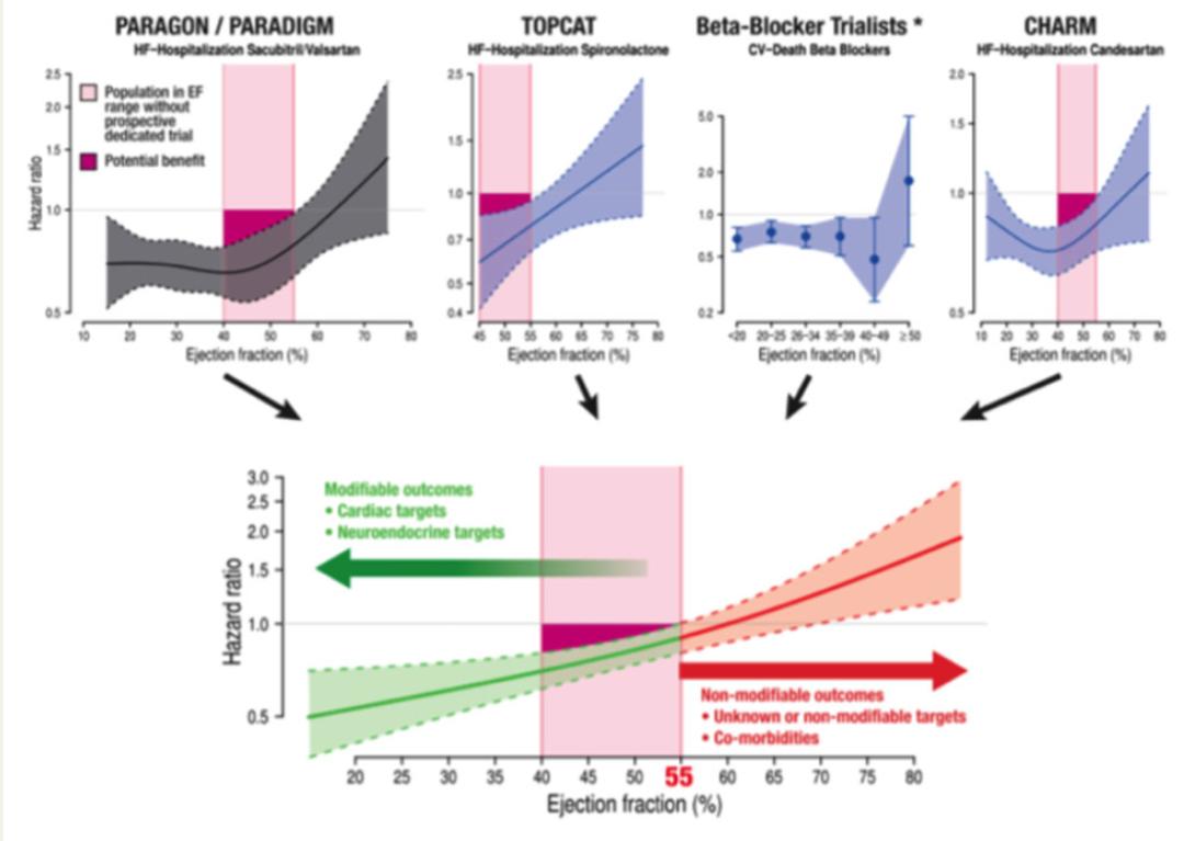 图2 来自不同试验的结果显示,其获益可扩展至LVEF>55%的患者
