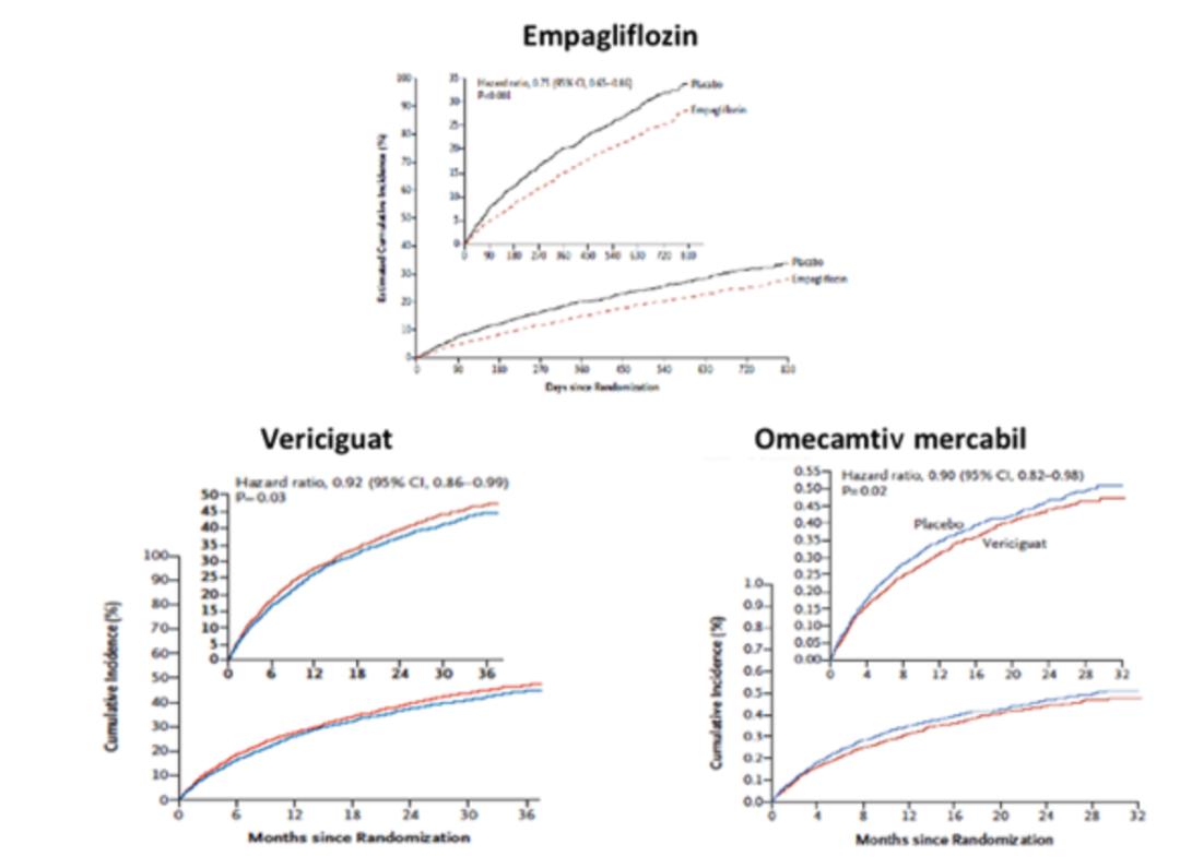 在最近的HFH之后,在整个EF谱范围内患有T2DM和HF的患者中,SOLOIST试验显示CV死亡,总HFH和HF的紧急就诊的主要终点指标降低了。此外,对于患有或不患有糖尿病(DAPA-CKD)的肾脏疾病患者,达格列净预防肾脏功能恶化。在大型结果试验VICTORIA和GALACTIC-HF中,两种新药是可溶性鸟苷酸环化酶激活剂和肌球蛋白激活剂omecamtiv mecarbil,主要降低了HF恶化的高危患者的HFH。在AFFIRM-AHF试验中,在HF代偿失调后,静脉铁羧麦芽糖降低了铁缺乏症患者的HFH。