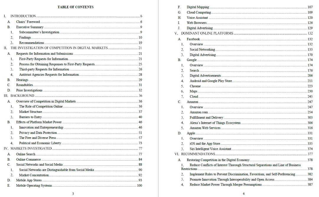 小组委员会根据大量事实生成这份报告,其中包括1,287,997份文档和通讯记录;38位证人的证词;跨越1,800多页的听证记录;来自各个政治领域的60位反托拉斯专家提交了38篇论文;以及对240多个市场参与者、被调查平台的前员工以及其他个人的采访,总计耗时数千小时。