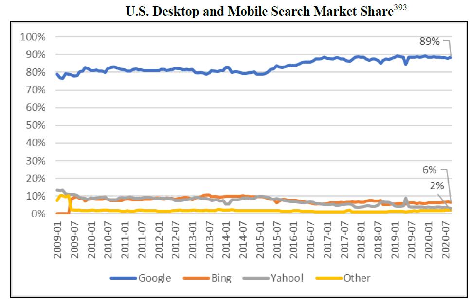 Google在通用在线搜索(general online search)和搜索广告市场上处于垄断地位。Google的市场支配地位源自于其高进入壁垒,这其中包括点击和查询数据(click-and-query data)以及Google在全球大多数设备和浏览器上广泛取得的默认安装地位。