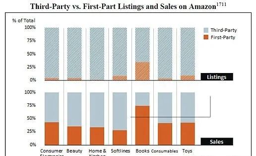 Amazon是具有支配地位的在线市场(online marketplace)。据报道,它控制着美国65%至70%的在线市场销售额。在与第三方卖家以及Amazon称之为vendor的许多供应商(supplier)的交易中,平台的市场势力达到了顶峰。Amazon也越来越多地通过其B2B市场Amazon Business上获得市场力量。