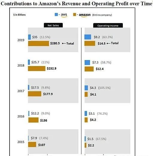 2019年AWS收入同比增长37%,达350亿美元。零售业务是Amazon的最大收入来源,但AWS是其整体利润的关键来源。2019年,虽然云业务仅占Amazon总收入的12.5%,但其贡献了集团60%以上的营业利润。