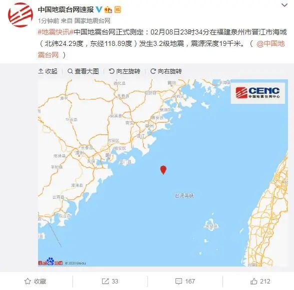 ■ 据国家地震台网官方微博消息,中国地震台网正式测定:2月8日23时34分在福建泉州市晋江市海域(北纬24.29度,东经118.89度)发生3.2级地震,震源深度19千米。