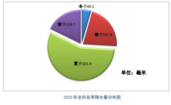 全市年平均降水量886.0毫米,比常年(613.0毫米)偏多4.5成。四季降水均偏多,其中冬季和春季降水异常偏多。