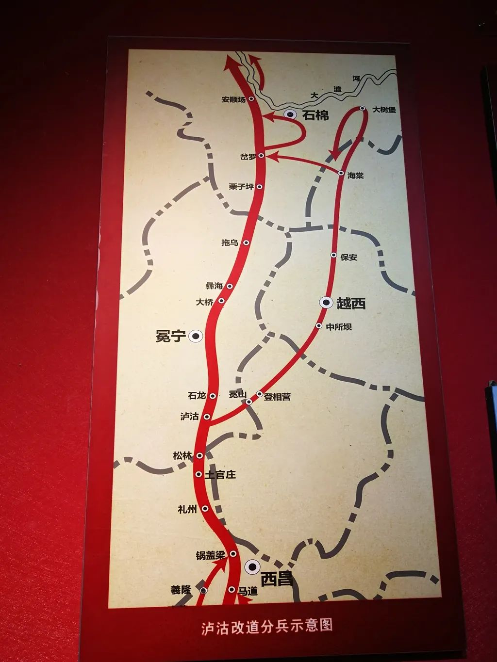 当时,从中央红军所在的冕宁泸沽到大渡河,中间隔着大凉山彝区,有两条路可走:一条是大路,翻越小相岭,经越西县城到大树堡,由此渡过大渡河;另一条是小路,从泸沽过冕宁,经大桥、拖乌,穿过冕宁西北的彝族聚居区到达大渡河边的安顺场。
