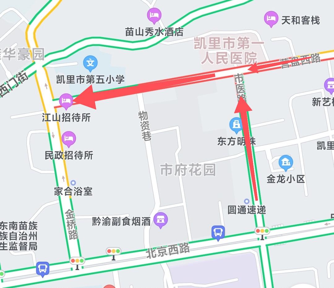 市医院路口至金玉商场路口路段,调整为单向通行,所有车辆由市医院路口进入营盘西路,由金玉商场路口驶出。