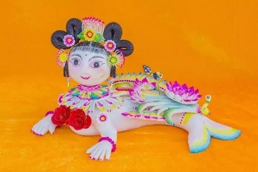 何仙姑也能幻化成美人鱼,胸口两朵大玫瑰象征着浪漫,身上盛开着莲花,吸引酒醉的蝴蝶。