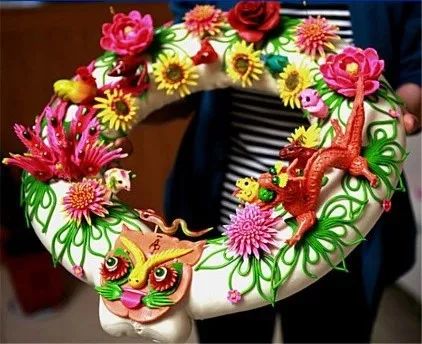 但凡你能想到的中国元素,都能在花馍上找到。大红灯笼高高挂,神龙见首不见尾。