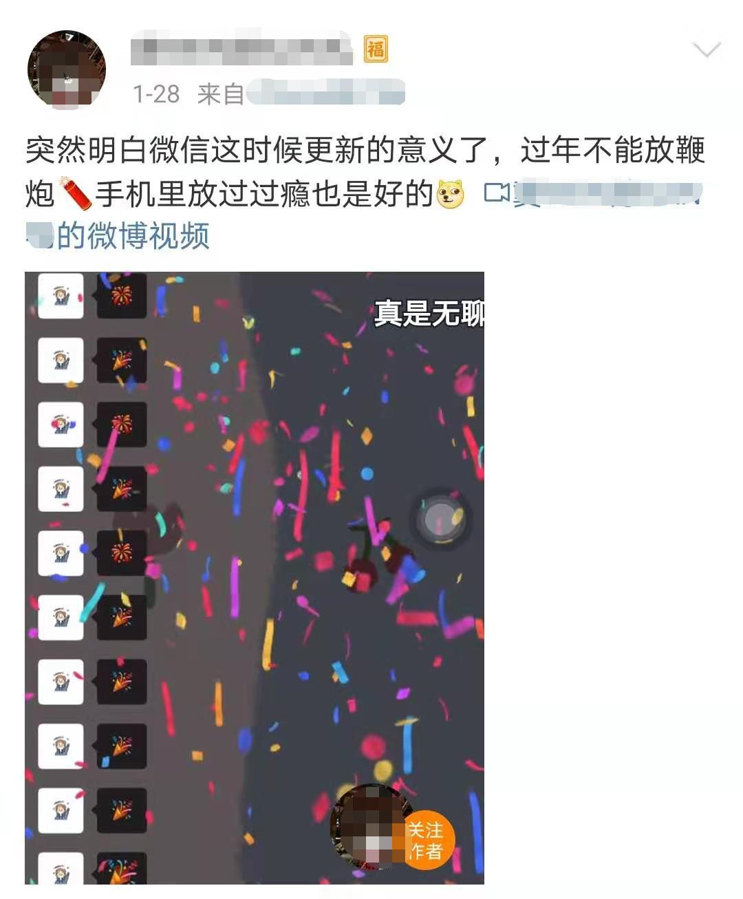 还有网友表示,在微信群里上演烟花爆竹秀,朋友圈里云拜年,既环保又安全: