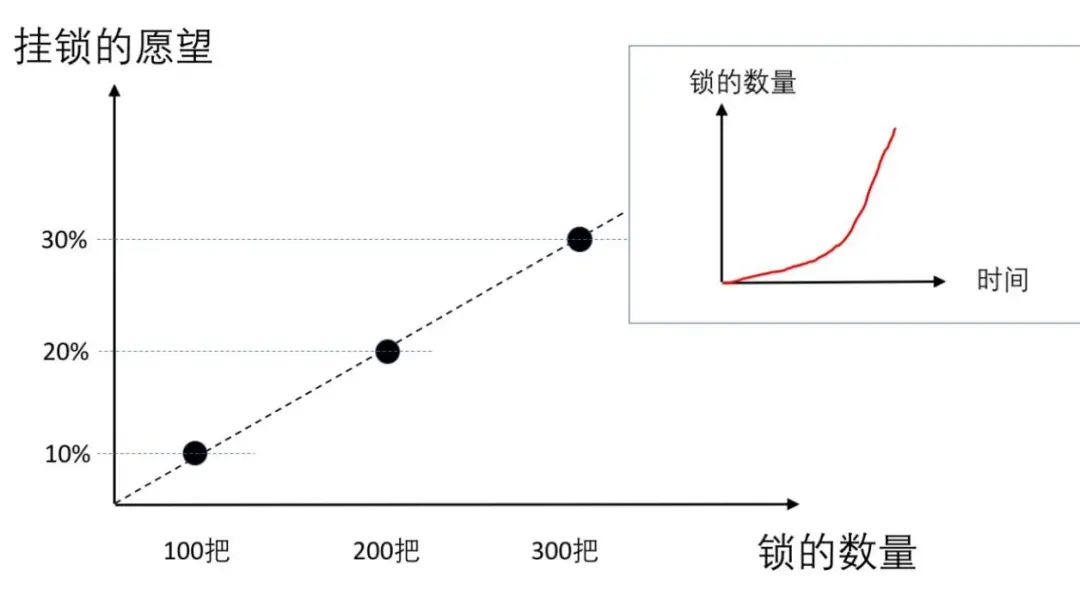 然而,受这种心理现象影响,锁的数量与时间的关系就会出现本质的变化(图4右上角)。假定每天来小院的人一样多,刚开始的时候院里锁少,进来的人挂锁的愿望也少,可是随时间推移院里锁越来越多,进院人挂锁的欲望也越来越强烈。虽然同样一段时间内进院人数不变,可是欲望高了,同一个时间段内挂锁的数量就会大大增加。扎堆现象就是这样产生的。