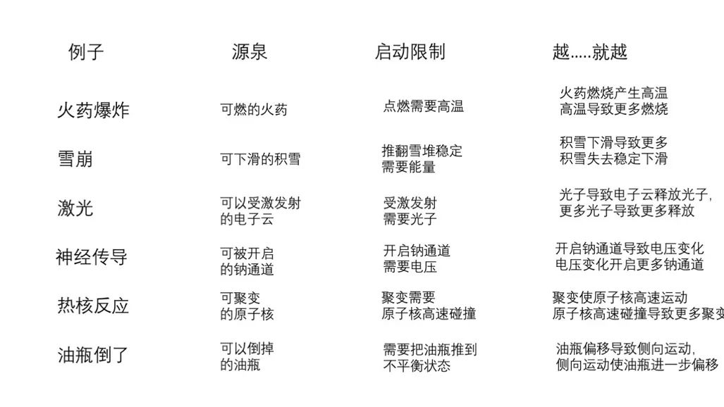 二叔说:“核爆炸俺不懂,但正反馈在日常生活中有大量的例子,尤其是需要把极小的事件放大几十亿倍的过程,往往都需要正反馈这个机制。所有正反馈过程都有几个共同的特征,就是要有一个可以积累的源泉,同时要有某个限制正反馈启动的限制。有了启动限制正反馈就不会随时随地发生,而让源泉可以积累到比较多。源泉积累越多则反应才可能越激烈,最后出现爆炸性后果(图6)。”