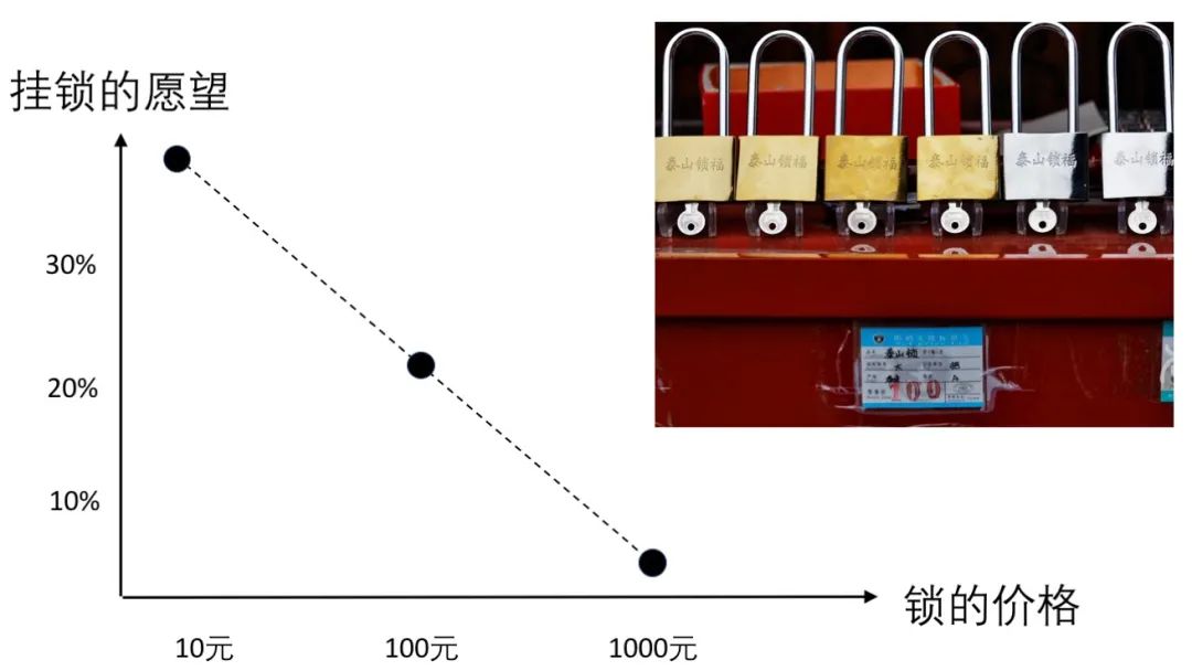 图7. 锁的价格与挂锁的愿望成反相关。价格越贵游客挂锁的愿望越低。可以用这个负反馈机制来防止小院里有过多的锁。