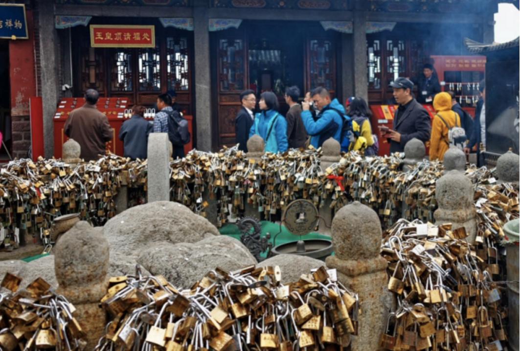 这锁要卖100块钱一把,这么个小院里就锁了一百多万吧?正想着,二叔从后面蹭过来,手里也拿了把黄灿灿的“泰山锁”,还低头念念有词,转身把那锁挂上去了。崭新的锁只闪亮了几秒钟,就汇入了那片金色的海洋,找不到了。是什么力量能让平时连泡面都舍不得加蛋的二叔,专门跑了那么远,还要花一百块钱来许愿呢?小刚没敢多问,前几天好像隐约听说他一直单恋的女神跟别人生了二胎,因此好多天一直阴着个脸。“买把100块钱的锁能治好抑郁,也是物超所值了。”小刚暗道。果然,二叔挂完锁脸上云开日出,话也多了。
