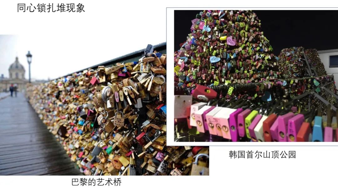 二叔说,这挂同心锁不是咱中国人专有的迷信,国外也兴这个。比如前几年就在巴黎火得不得了(图1)。世界各地都有类似现象,就连美国鸟不拉屎的人少地带,也有人在通过公路的行人天桥上挂同心锁。