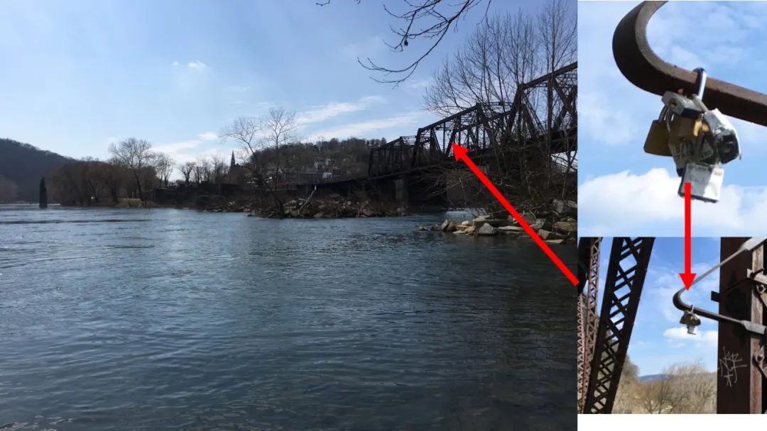 图2. 美国铁锈地区的旧桥上,寥寥几把同心锁也会扎堆
