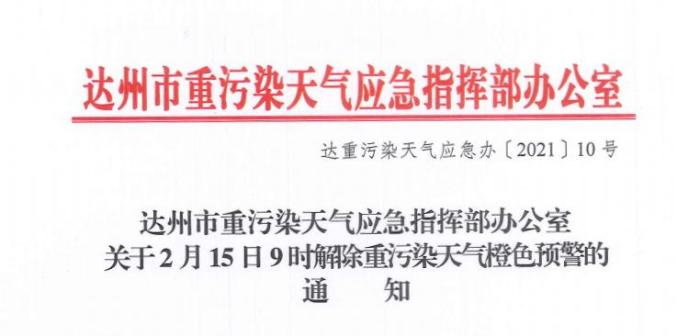 根据市生态环境局、市气象局联合会商,近期我市气象条件好转,空气质量将出现改善,按照相关规定,报市重污染天气应急指挥部批准,决定于2021年2月15日9时解除本轮重污染天气橙色预警。