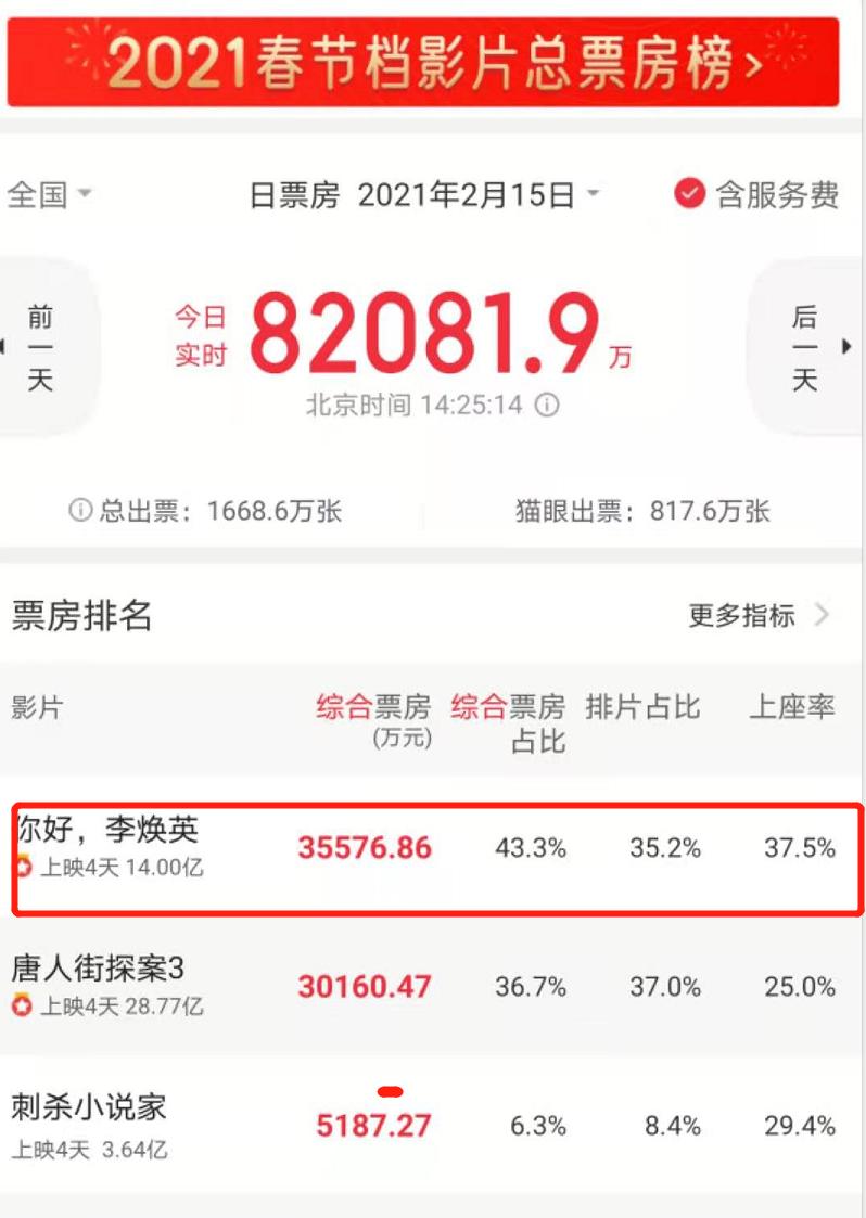 截至中午14时30分,《你好,李焕英》的单日票房,在排片仍落后前者的情况下,反超5000多万元,近乎38%的上座率,领先了《唐探3》12个点。