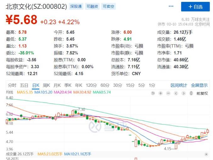 2018年信息披露违规,公司多计营业收入4.6亿元,多计净利润1.91亿元。其次,因郑爽事件导致其参演的相关作品无法播出,应收账款无法收回,北京文化又背上了一笔5亿元的贷款逾期,另外,2020年净利润亏损、遭证监会立案调查等负面消息频出,所以开年1月4日、1月5日两天连续两天跌停,股价表现不佳,但是随着春节档的热度不断高涨,北京文化股价所有抬升。截至春节前,北京文化报5.68元,最新总市值为40亿元。