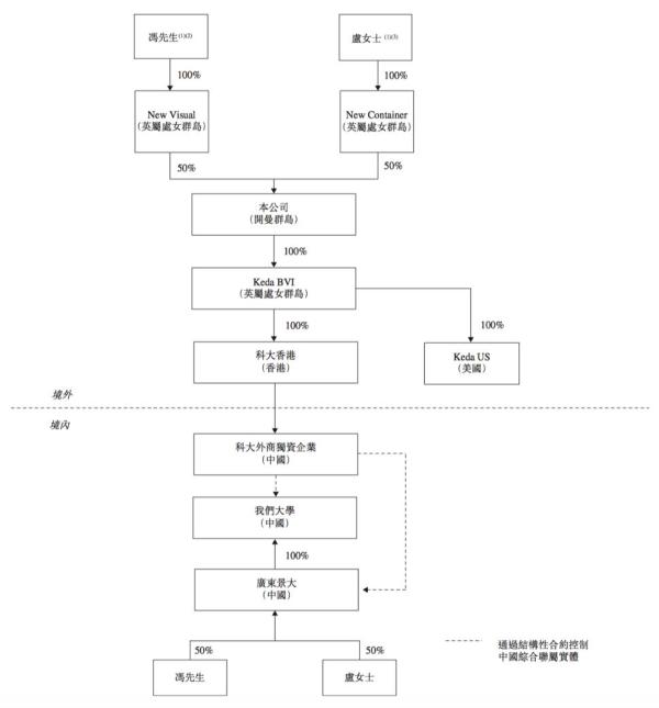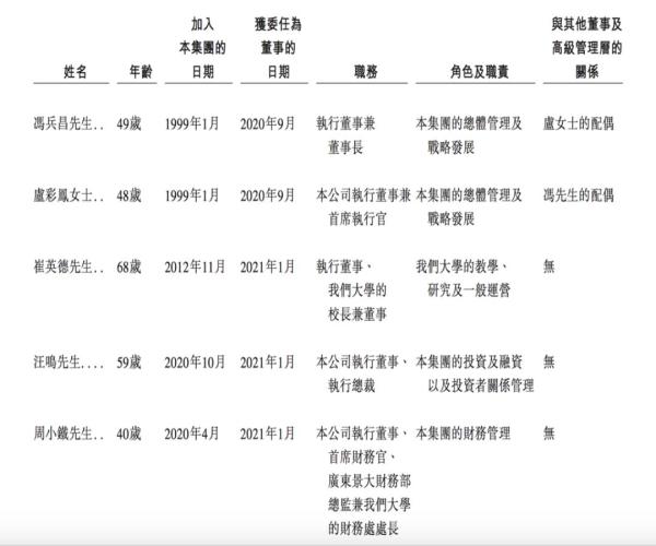 “中国科大教育集团有限公司”的股权架构与景大公司一致,亦是冯兵昌和卢彩凤两位股东各持股50%。根据“中国科大教育集团有限公司”招股书,冯兵昌和卢彩凤两人系夫妻。冯兵昌任“中国科大教育集团有限公司”执行董事兼董事长,卢彩凤任执行董事兼首席执行官;广科大校长崔英德任执行董事。
