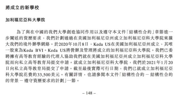 招股书披露,“中国科大教育集团有限公司”计划在美国加利福尼亚州成立“加利福尼亚科大学院”。2020年10月8日,Keda US在美国加利福尼亚州成立,负责运营及管理将成立的“加利福尼亚科大学院”,并于2021年1月20日向加利福尼亚州私立高等教育局提交了申请。截至2021年1月22日,“中国科大教育集团有限公司”已就成立“加利福尼亚科大学院”花费约33500美元。