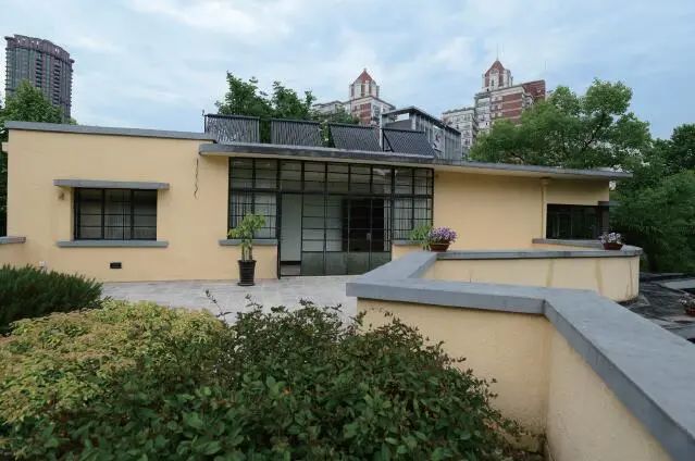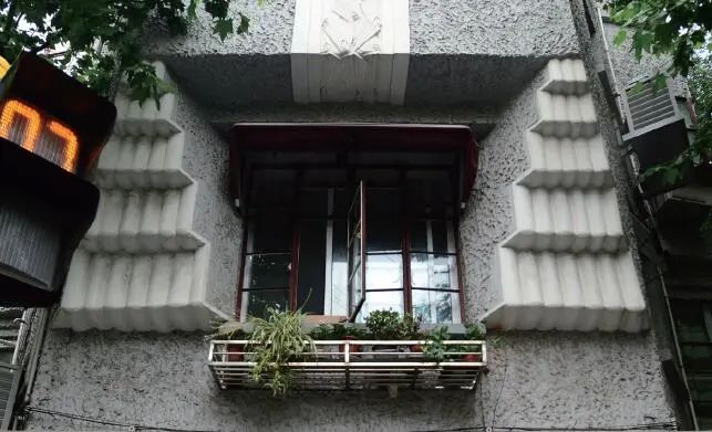 武康路12号是著名建筑师谭垣设计的自宅。这座现代风格的别墅外观“摩登”,有明亮的转角弧形窗和铸铁栏杆阳台,面向武康路的东立面点缀有小圆窗和通高两层的长窗,生动耐看。别墅有一个精巧的庭院。