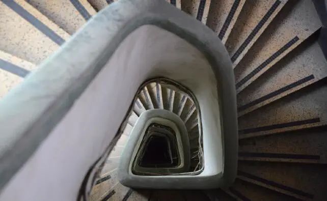 与外观相比,公寓的楼梯设计更为精巧。设计师发挥“螺蛳壳里做道场”的精神,最大限度地利用了这块六角形的小基地。楼梯仅采用两种朴素的材质——灰色水泥和黄色水磨石,看似无奇,但如果走到顶楼向下看,一圈圈楼梯恰好绕成美丽的漩涡,极富设计感。