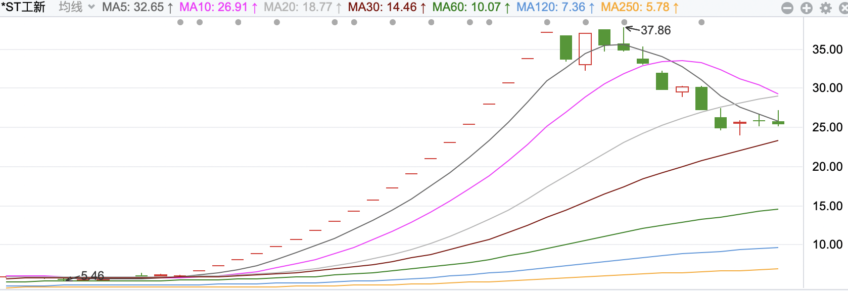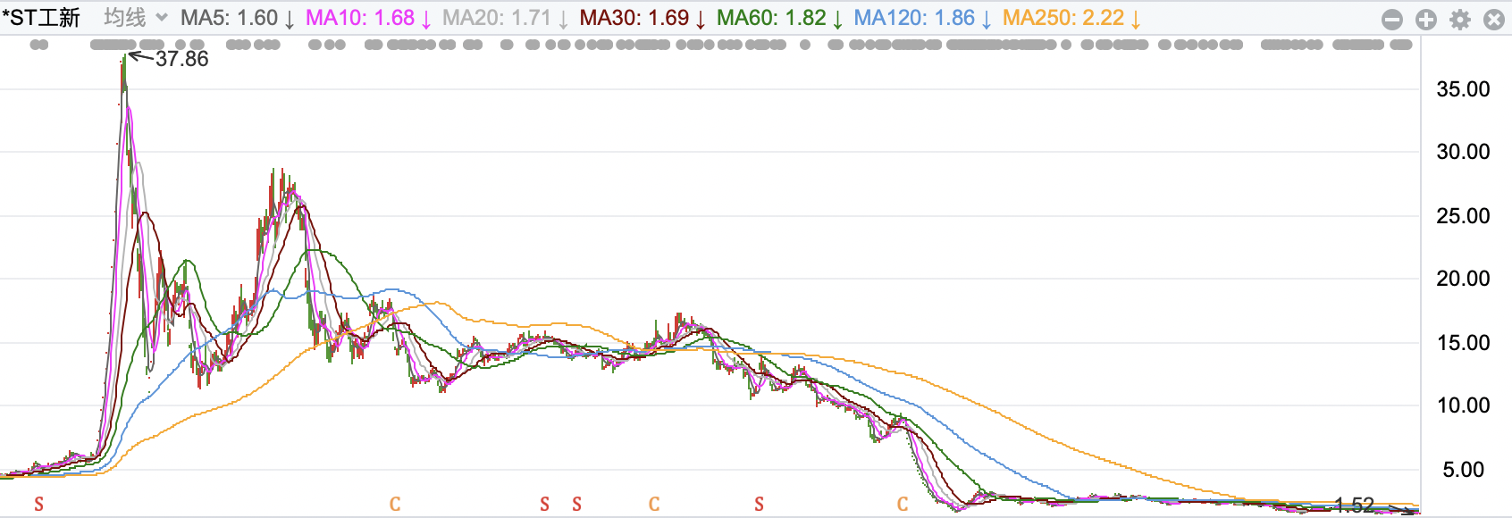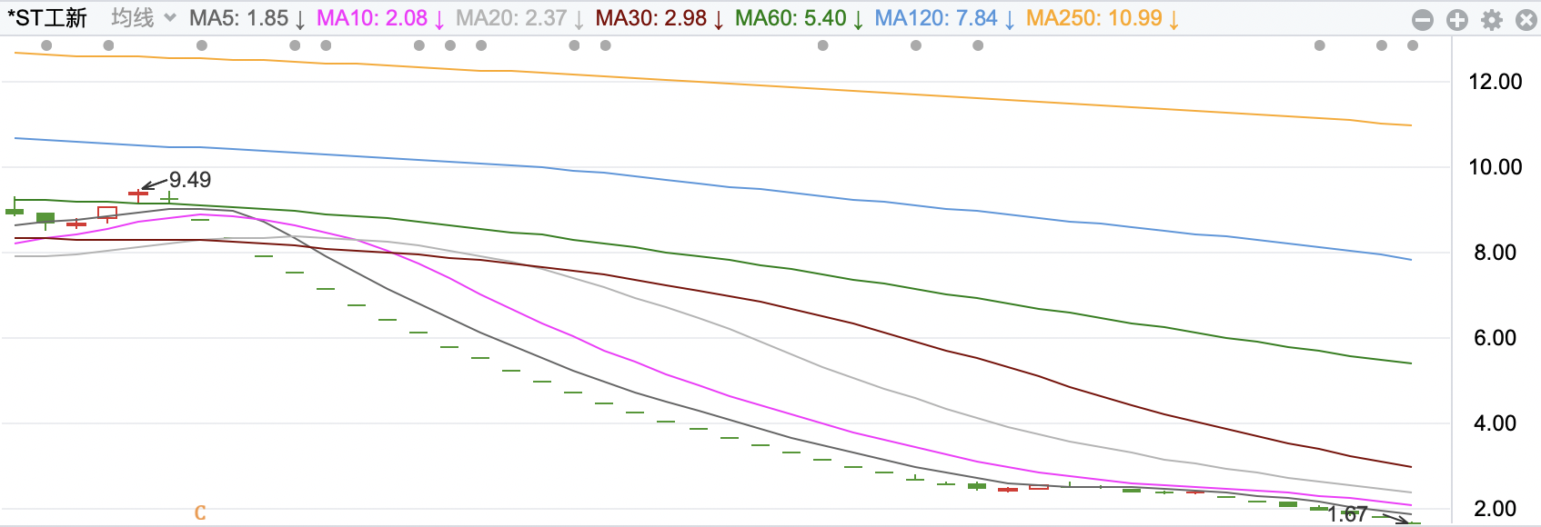 在K线图上,*ST工新的股价停留在2020年4月28日,收盘1.17元,相比多年前的最高价37.86元,已经是云泥之别。