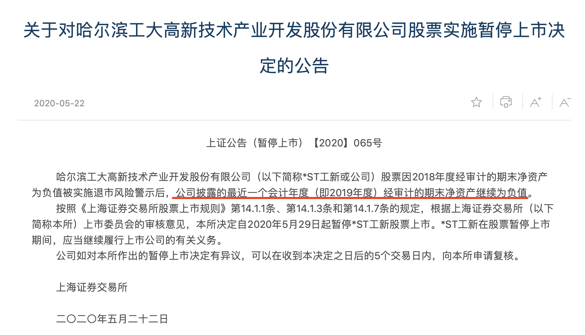 2020年因公司最近一个会计年度经审计的期末净资产继续为负值,工大高新被实施暂停上市。