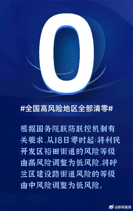 2)全国高风险地区全部清零。根据国务院联防联控机制有关要求,从18日零时起:将利民开发区裕田街道的风险等级由高风险调整为低风险、将呼兰区建设路街道风险的等级由中风险调整为低风险。此外,还有中风险等级地区4个,分别是河北省石家庄市藁城区、黑龙江省绥化市望奎县和上海市浦东新区高东镇新高苑一期小区,以及吉林省通化市东昌区的五个小区。