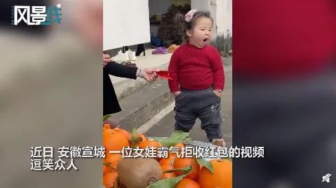 8)近日,安徽宣城,一位女娃霸气拒收红包的视频,逗笑众人。视频中,女娃双手插兜,漫不经心地打着哈欠,对红包毫无兴趣。面对被塞到兜里的红包,萌娃竟看都没看一眼,嘟着小嘴,把红包扔在了地上,网友搞笑评论:“给红包,还没有一根棒棒糖杀伤力大”。