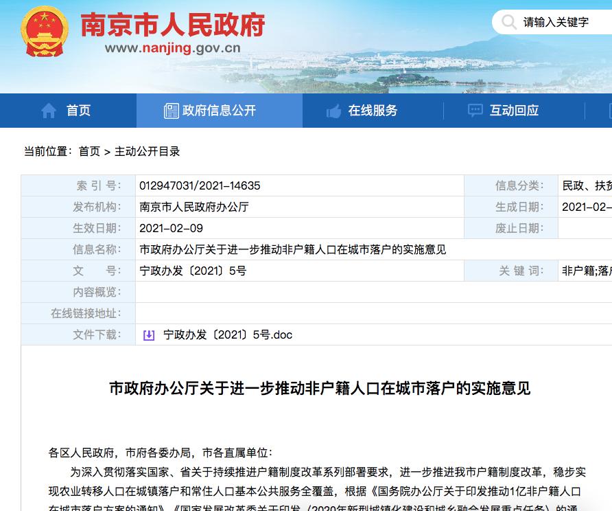 2月9日,南京市人民政府办公厅悄然在官网发布《关于进一步推动非户籍人口在城市落户的实施意见》,以进一步加快推动非户籍人口在南京落户。