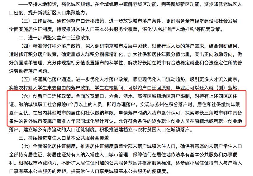 《意见》重点提及要进一步调整完善户口迁移政策,除了原有的积分落户政策和人才落户政策,还需要创新户口迁移政策,全面放宽浦口、六合、溧水、高淳区城镇地区落户限制,对持有上述四区居住证、缴纳城镇职工社会保险6个月以上的人员,即可办理落户。